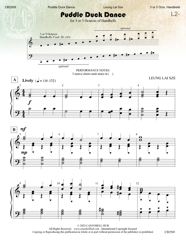《Puddle Duck Dance》是一首充滿歡樂的手鈴作品,非常適合初學者演奏。輕快的節奏與簡潔的結構,能有效幫助手鈴演奏者掌握基本技巧。旋律活潑生動,彷彿描繪出小鴨在水坑中快樂嬉戲的畫面,是一首既有趣又富表現力的演奏曲目。