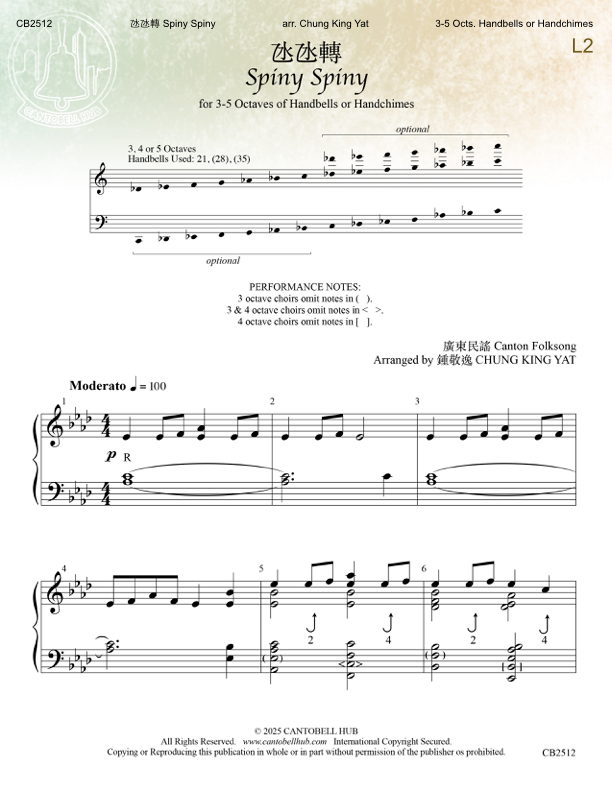 《氹氹轉》是最具代表性的廣東兒童歌曲之一,旋律簡單、輕快,充滿童年的純真與歡樂。這首手鈴編曲作品巧妙地展現了旋律的俏皮與愉悅氛圍,彷彿孩子們在遊戲中旋轉、歡笑的場景。作品結構簡潔,不僅易於掌握,也能讓演奏者與聽眾一同感受童趣盎然的音樂魅力。